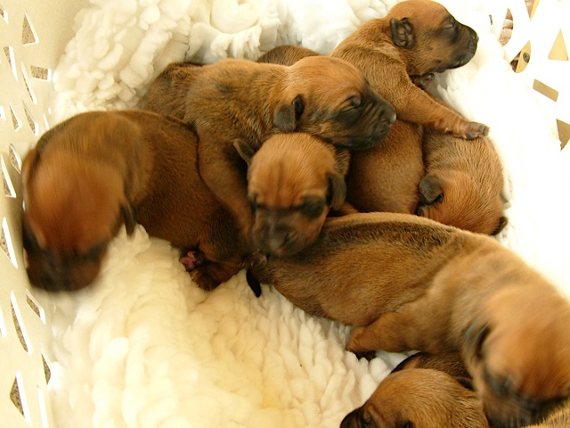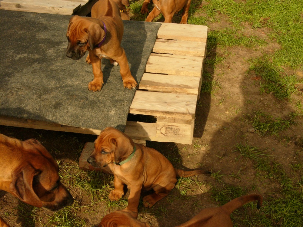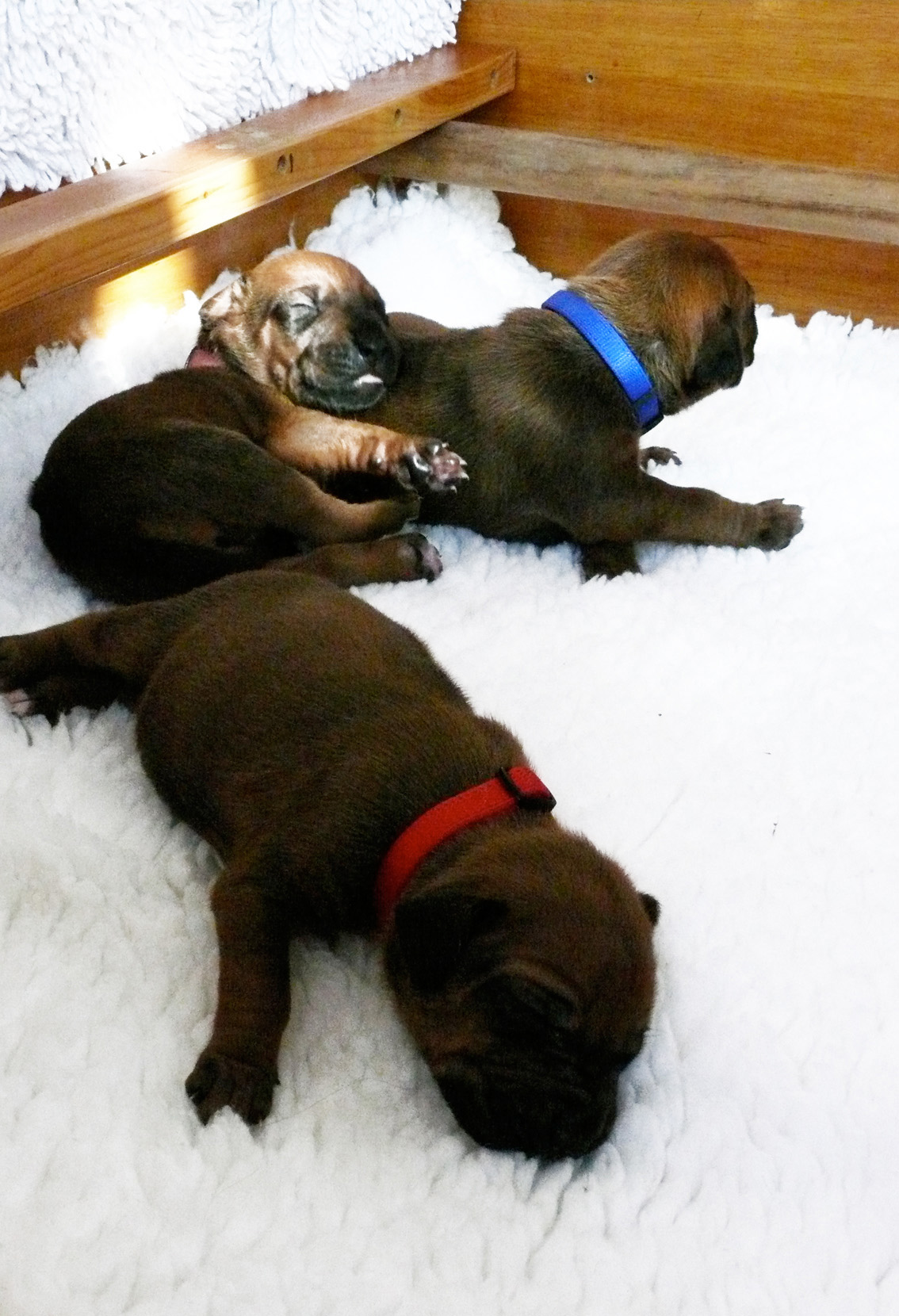 In der Nacht vom 25. auf den 26. Juni 2013 wurden acht gesunde Welpen geboren. Zwei Hündinnen sind ridgelos. Von den sechs Ridgeträgen haben zwei Hündinnen versetzte Crowns und ein Rüde drei Crowns. Bei drei Rüden sind Ridge und Crowns korrekt. Eine Hündin mit versetzten Crowns hat an der Rutenspitze zudem einen nicht sichtbaren leichten Knick. Es gab keinen Rück-, Vor- oder Kreuzbiss bei den Welpen. Bei allen Rüden sind die Hoden rechtzeitig abgestiegen. Im Wurf gab es keinen Dermoid-Sinus.