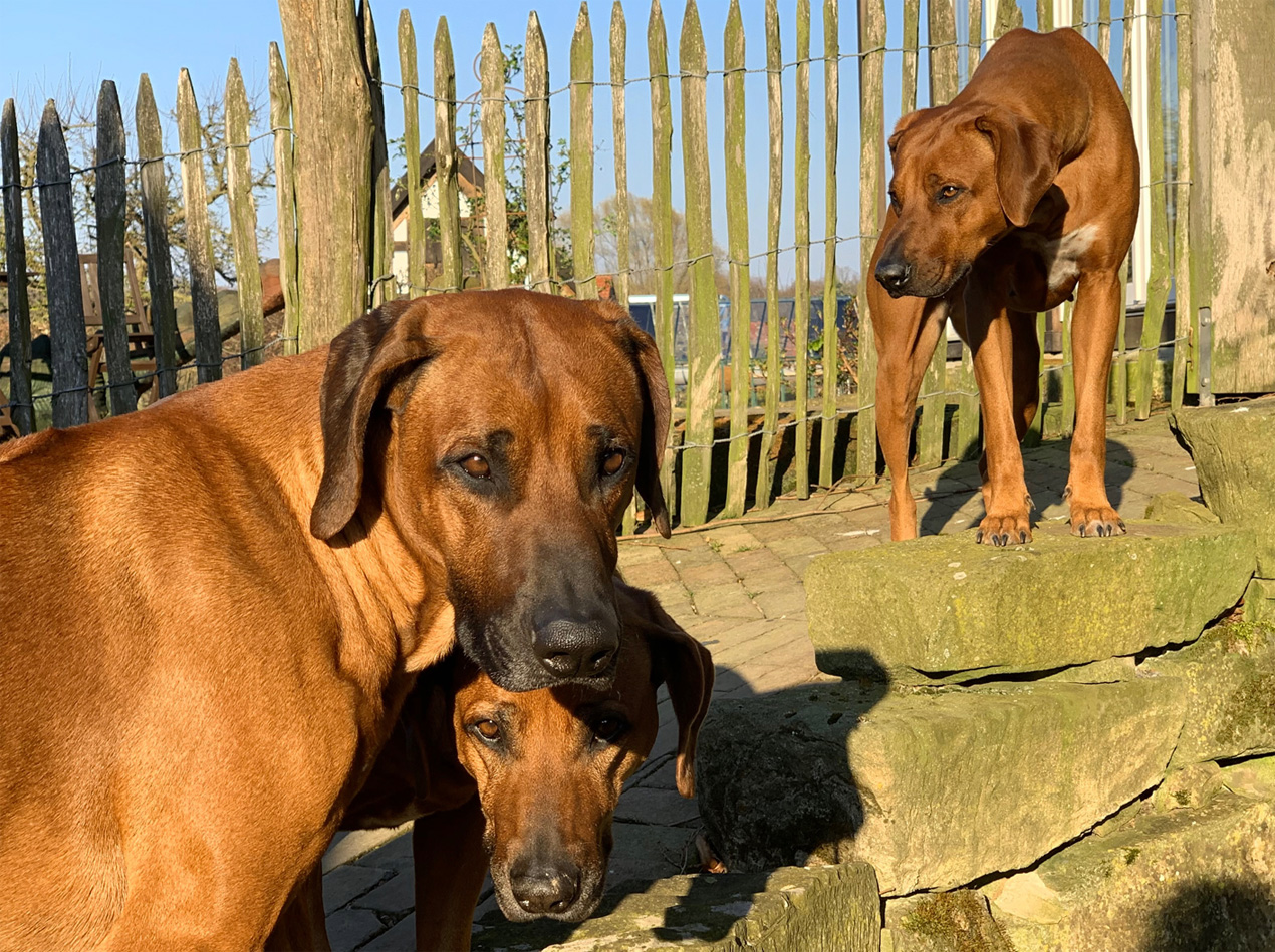 Mit unserer Hündin Imara Themba haben wir 2013 einen ersten Wurf gewagt und wollten auf jeden Fall einen Welpen behalten. Unsere Wahl fiel auf die Letztgeborene. Afra, so heißt sie, hat sich zu einer prächtigen Hündin entwickelt. Eine Zeit lang gehörte noch Akim, ein stattlicher Rüde zu unserem Rudel. Auch Afra hat uns im Jahr 2017 einen Wurf geschenkt, aus dem zwei Welpen bei uns geblieben sind. Nunmehr leben Afra, deren schlaue Tochter Bayo Blanka und ihr ausgeglichen freundlicher Sohn Bhengu Adnan Moyo mit uns im Mittelbrinker Forsthaus. Die drei haben sich zu einem wunderbaren Team entwickelt, das einen überallhin begleiten kann. Was will man mehr.